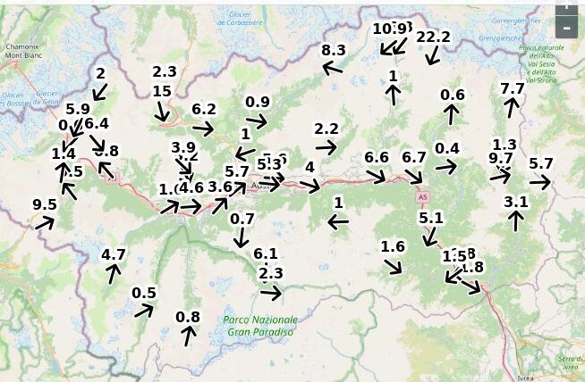 | Direzione vento Aosta: | 61-59-80 Est ![]() |