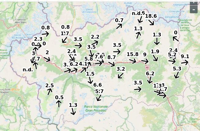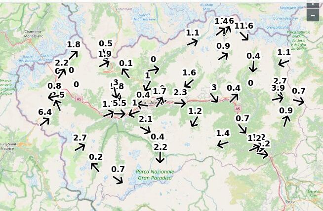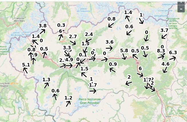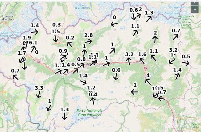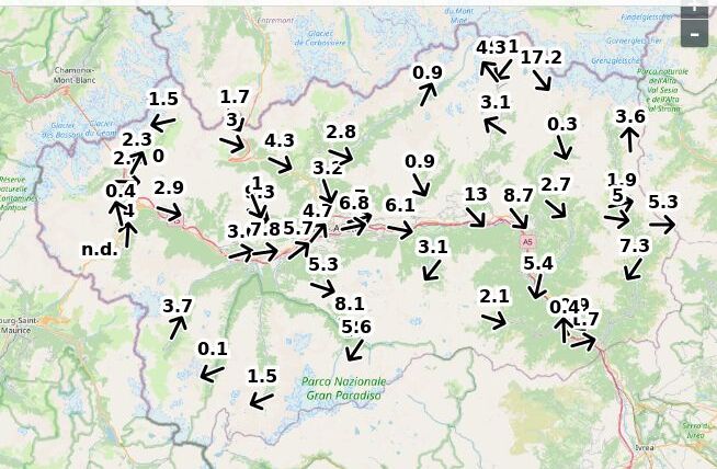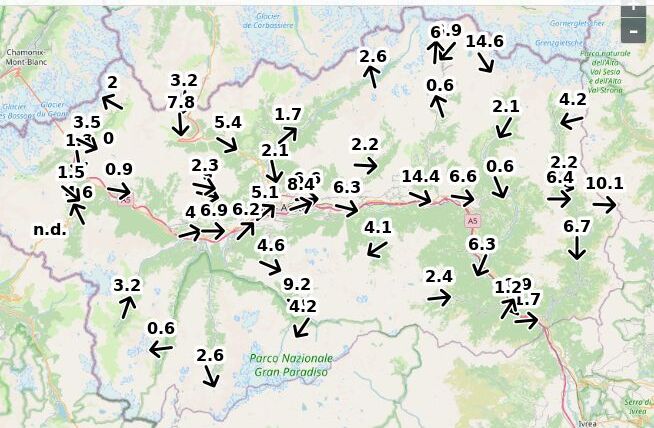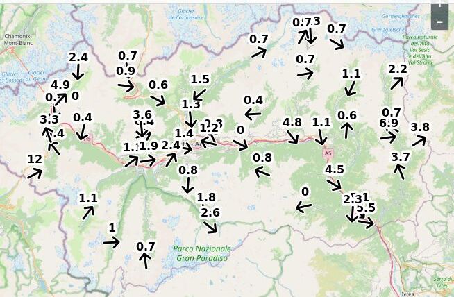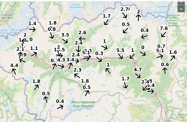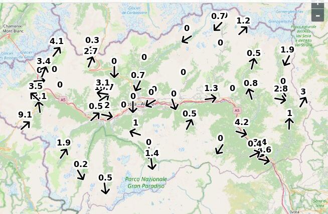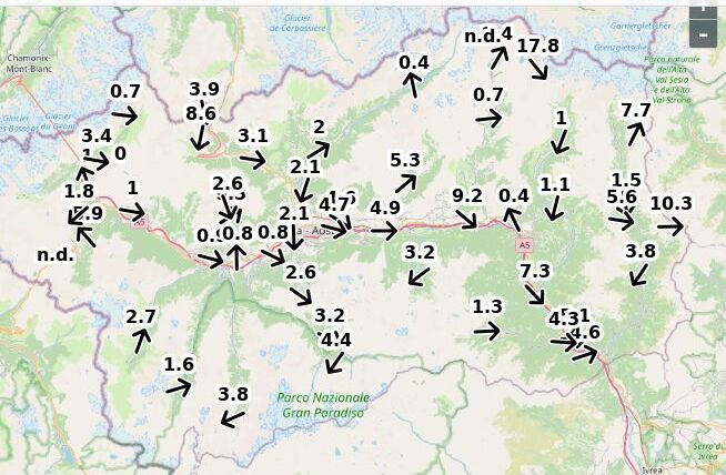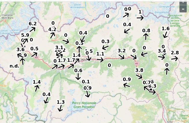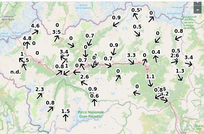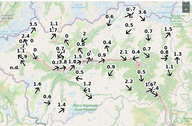 | Velocità vento Aosta: | 5.2-5.2-3.7 m/sec |