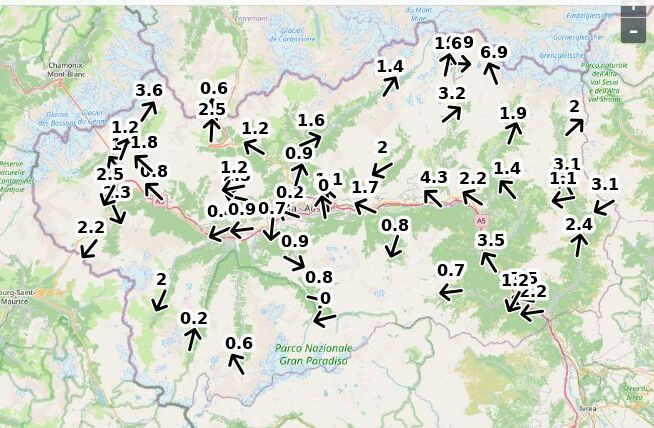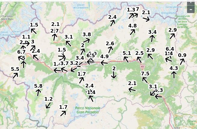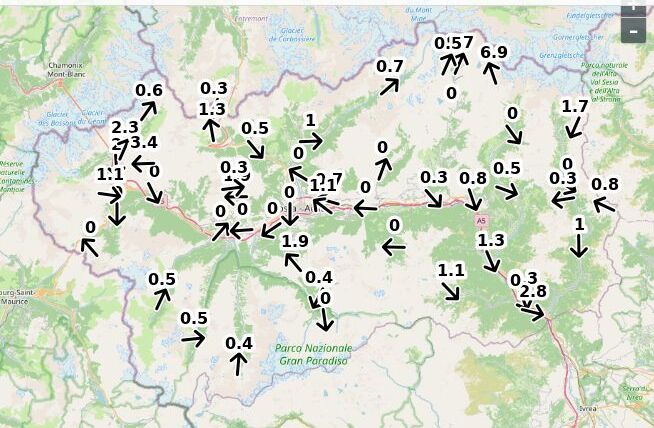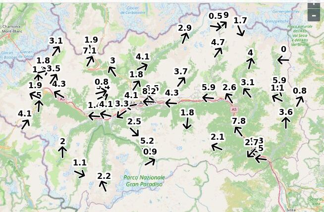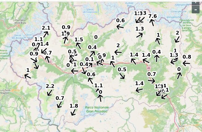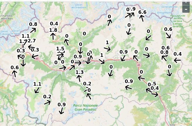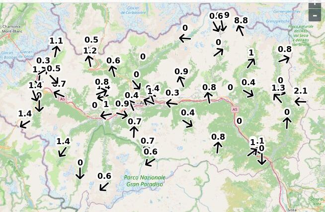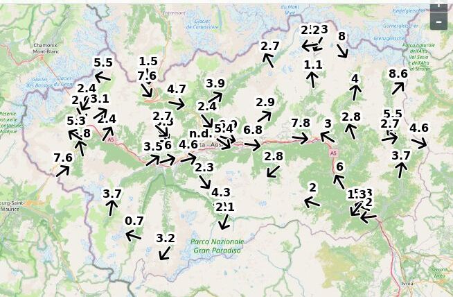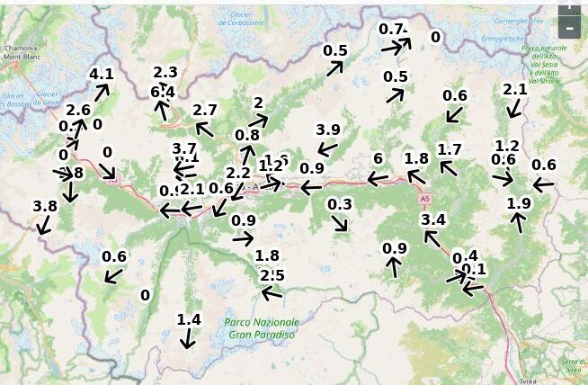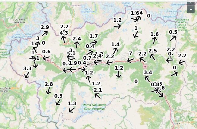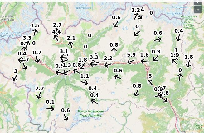 | Direzione vento Aosta: | 83-4-8 Nord ![]() |